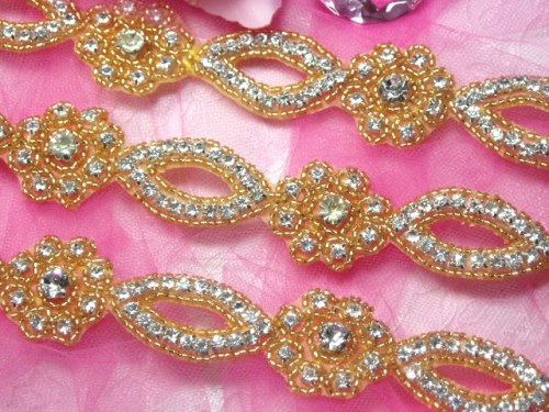 0429 Gold Beaded Clear Rhinestone Floral Trim